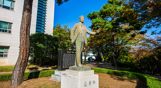 중앙도서관 광장에 있는 안중근 의사 동상은 안 의사의 숭고한 애국·애족 정신을 기리기 위해 2011년에 세워졌습니다.